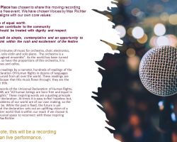 The opening words of the Universal Declaration of Human Rights, drafted in 1948, are “All human beings are born free and equal in dignity and rights.” These inspiring words are a guiding principle for the whole declaration. At times it is easy to feel hopeless but, just as the problems of our world are of our own making, so the solutions can be. While the past is fixed, the future is yet unwritten, and the declaration sets out an uplifting vision of a better and fairer world that is within our reach if we choose it. VOICES is a musical space to reconnect with these inspiring principles.” Max Richter