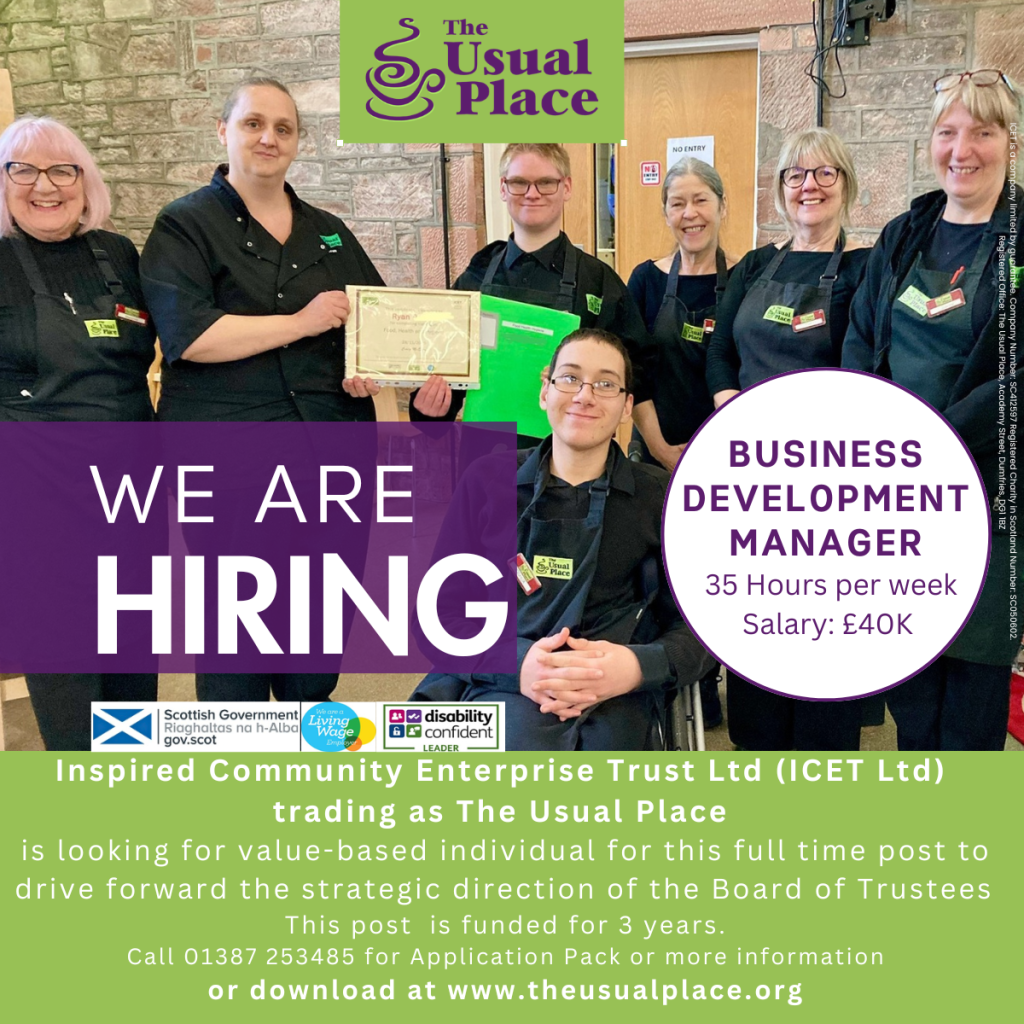 The Usual Place Cafe is a not for personal profit organisation based in Dumfries. You will work as part of a team who work with young people to deliver a welcoming customer experience, enabling them to gain the skills they need to achieve employment in the hospitality or retail industries.