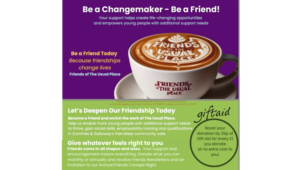 “Friends of The Usual Place come in all shapes and sizes. You can give whatever feels right for you – what matters is being part of a growing circle of encouragement that supports our work with young people with additional support needs. Every friendship adds up, and together they really do change lives” Craig McEwen, CEO The Usual Place